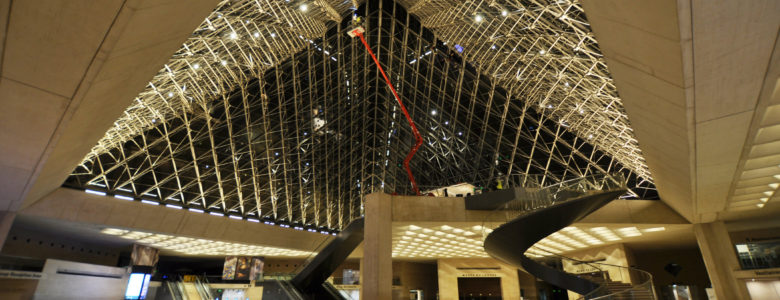 L’inspection a pour objectif de vérifier l’ensemble des éléments de la structure : systèmes d’accroche et de serrage, montants, arrêtes métalliques, poteaux, bielles, haubans, contreventements et câbles. Pour mener à bien cette mission, une nacelle araignée positionnée sur le belvédère a été utilisée par nos équipes d’inspection afin d’inspecter main sur l’ouvrage la structure de la pyramide.
