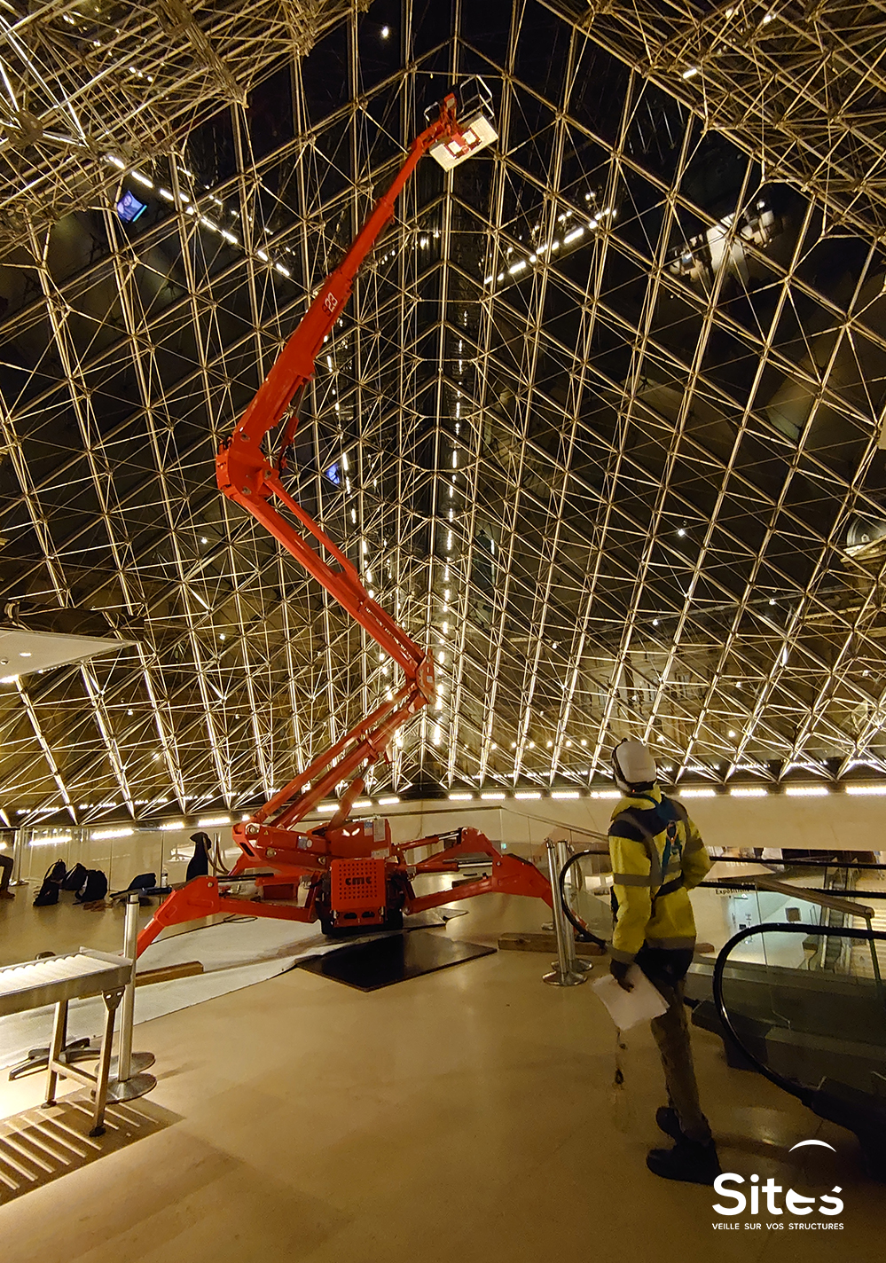 Dans le cadre de la surveillance de la grande pyramide du Louvre, le service gestionnaire de l’ouvrage a sollicité SITES pour la réalisation d’une inspection complète de la structure.