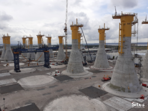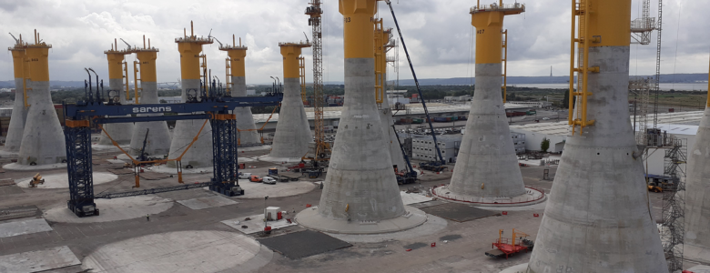 C’est sur le quai de Bougainville au Havre que nos équipes ont été impliquées dans ce chantier hors norme. D’importants travaux ont été réalisés sur plus de 27 ha pour construire les fondations de ces 71 éoliennes. Ces énormes structures en béton armé sur lesquelles reposeront les éoliennes en mer sont dites gravitaires (GBS : Gravity Based Structure) : remplies de ballast, leur emprise au sol ainsi que leur poids d’environ 5000 t chacune assureront la stabilité des éoliennes en mer. Ces fondations uniques mesureront 55 m de haut pour un diamètre au niveau du radier de 32 m afin de résister aux forces propres au milieu marin, notamment au vent, à la houle et aux courants marins.